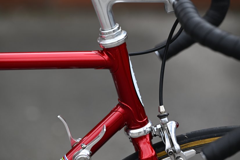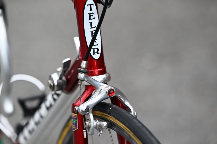 Another British handmade steel frame, this one made in his Dipton, County Durham workshop by Rob Telfer. Frame tubing is steel allow Reynolds 753. The bike is mainly equipped with a Campagnolo C Record group-set, apart from Mavic hubs. Mavic SSC rims with Vittoria Corsa tubular tyres complete the wheels. Saddle is a rare wide Unica Nitor. A particularly stunning feature of this bike is the ruby red ‘jewel’ centre cap bolts on its brakes.